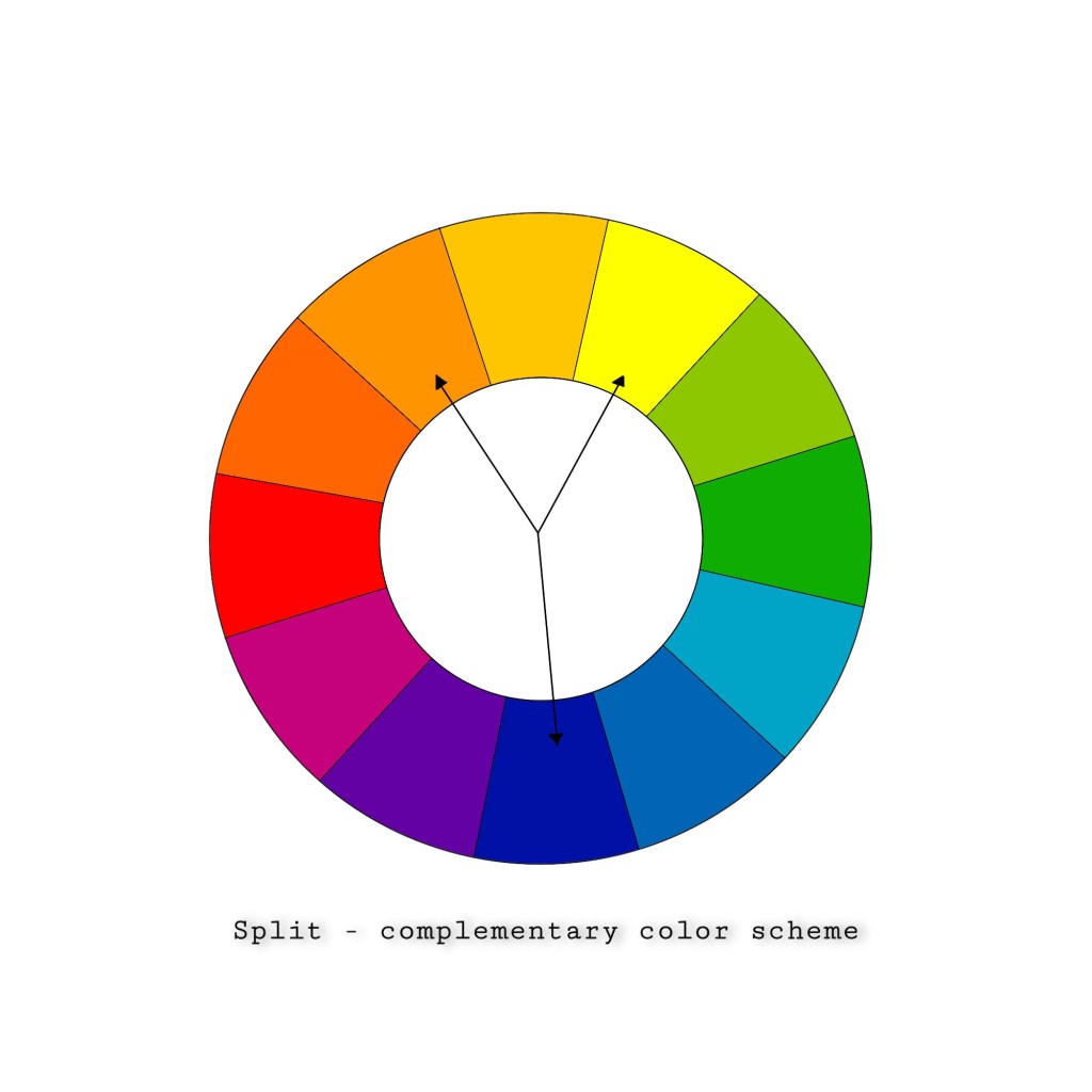 The color scheme is a variation of the complementary color scheme. Same strong visual contrast as complementary but less intense/tension.