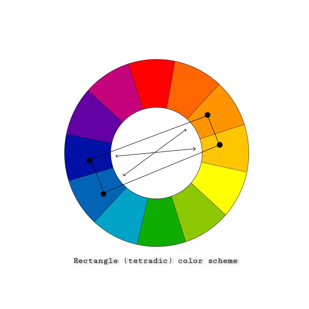 The color scheme uses for four colors arranged into two complementary pairs. There are plenty of possibilities for variation. This works best if you let one color be dominant.
