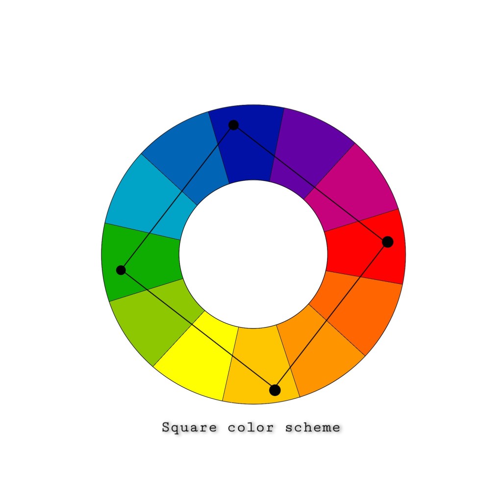 The square color scheme is similar to the rectangle color scheme, but with all four colors evenly spaced around the color circle. Same as other schemes, this works best when you let one color be dominant.